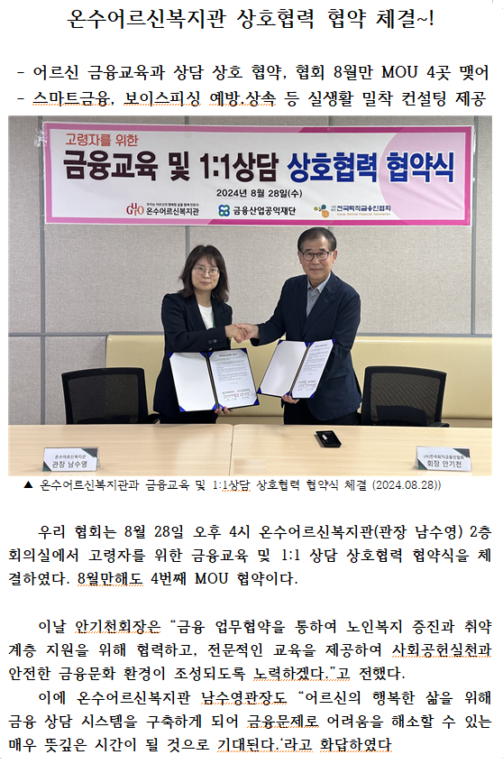 온수어르신복지관, (사)전국퇴직금융인협회와 MOU체결