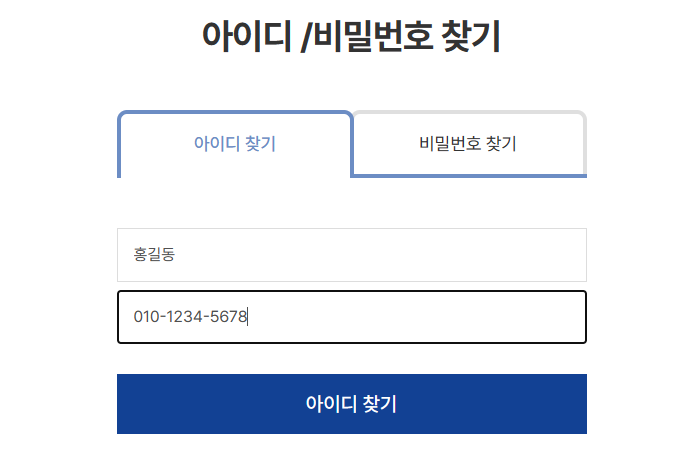 핸드폰 번호는 "-" 포함입력 예시)010-1234-5678
